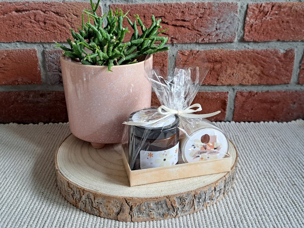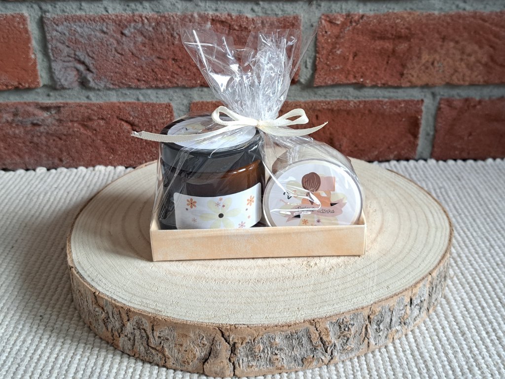 Rozměr balíčku: svíčka v hnedé skleničce - průměr 6,2 cm | výška 6,5 cm | + čajová svíčka - průměr 5,5 cm | výška 2,6 cm