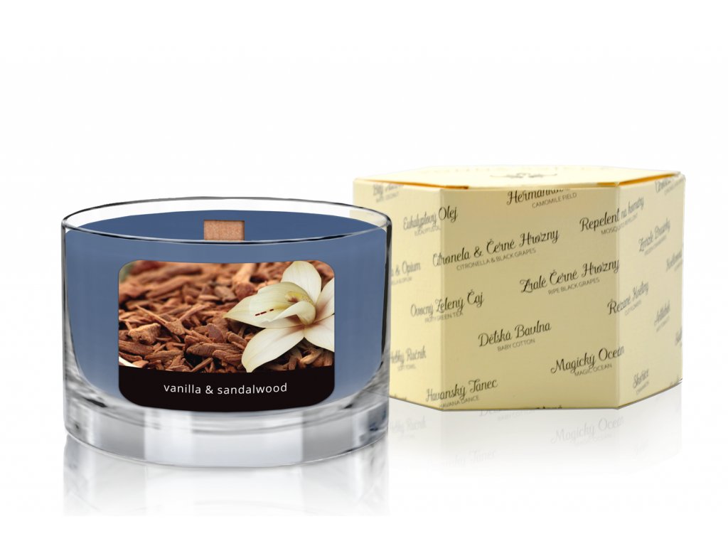 svíčka ve skle s dřevěným knotem | Vanilka & Santalové dřevo