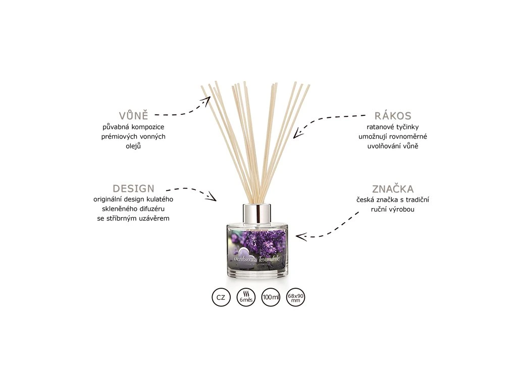 Velikost difuzéru 100 ml je vhodná do středně velkých místností. Náplň vydrží přibližně 6 měsíců v závislosti na velikosti, teplotě a větrání místa, kam difuzér umístíte. Po vypotřebování náplně lze samostatně dokoupit náhradní náplň se stejnou nebo jinou vůní. Skleněný difuzér stačí vypláchnout teplou vodou a případně dokoupit náhradní tyčinky.